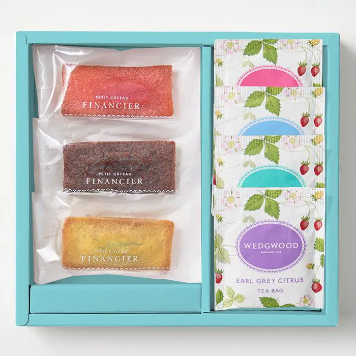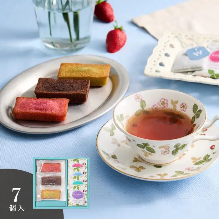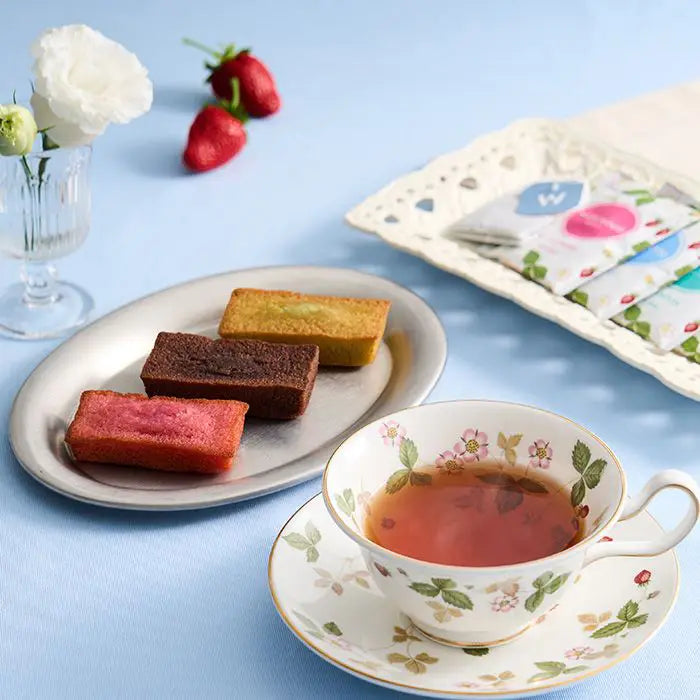 チョコ、ピスタチオ、ストロベリーの3種類のバラエティ豊かなフィナンシェとウェッジウッドの代表柄「ワイルドストロベリー」の可愛らしいパッケージに4種類のティーバッグをアソートしました。