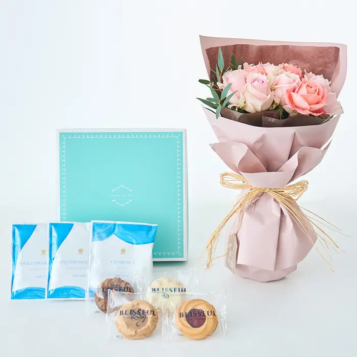 サブランカ農園で生産された豆を使用したコーヒーと、華やかな4種類のクッキーを詰め合わせをピンクのバラと一緒にお届けします。※クッキーはロイヤル コペンハーゲンの商品ではありません。