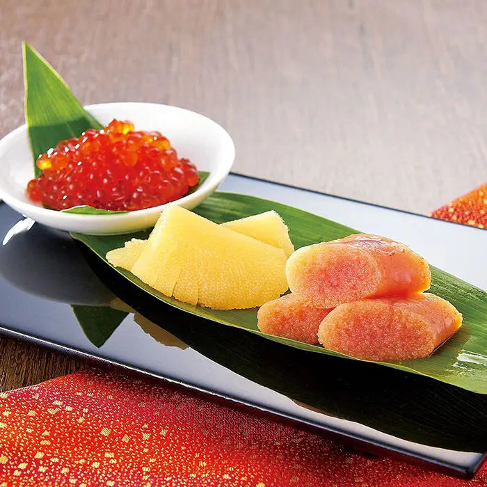 寒冷期に水揚げされた新鮮なすけとうだらの卵巣と魚醤を使用した福さ屋を代表する辛子めんたいをはじめ、味付数の子、北海道産の醤油漬いくらを詰合せました。味わい深い旨みとプチプチの食感が自慢です。