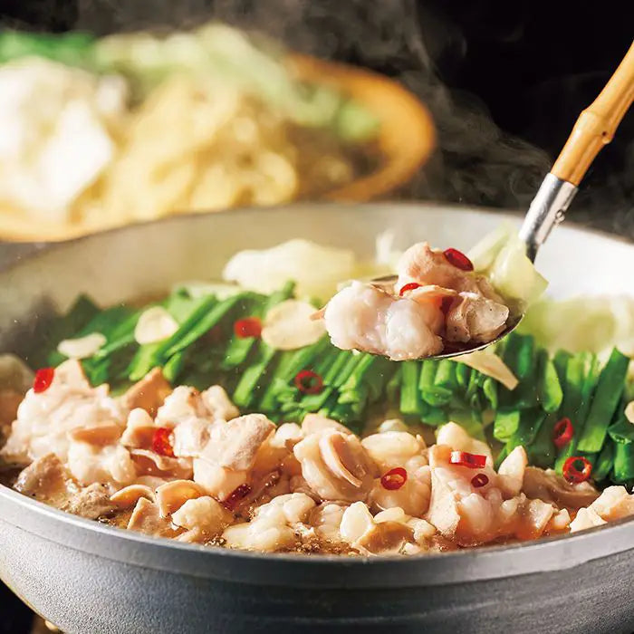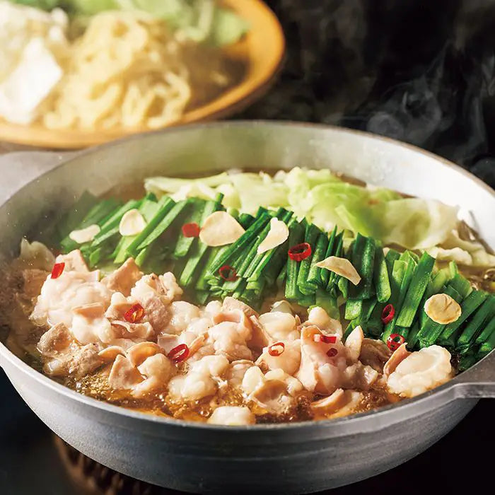国産小腸のみを使用した博多名物本格もつ鍋です。醤油ベースの濃縮スープが、もつのぷりっと弾ける食感と野菜の後をひく旨さを引き出します。