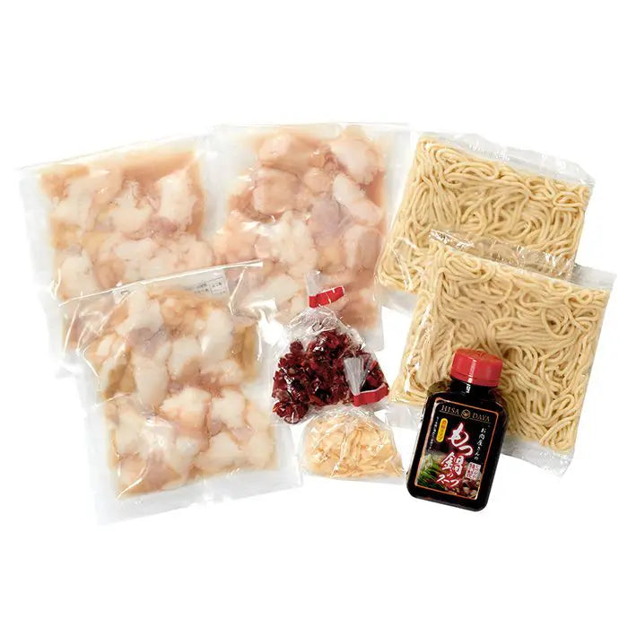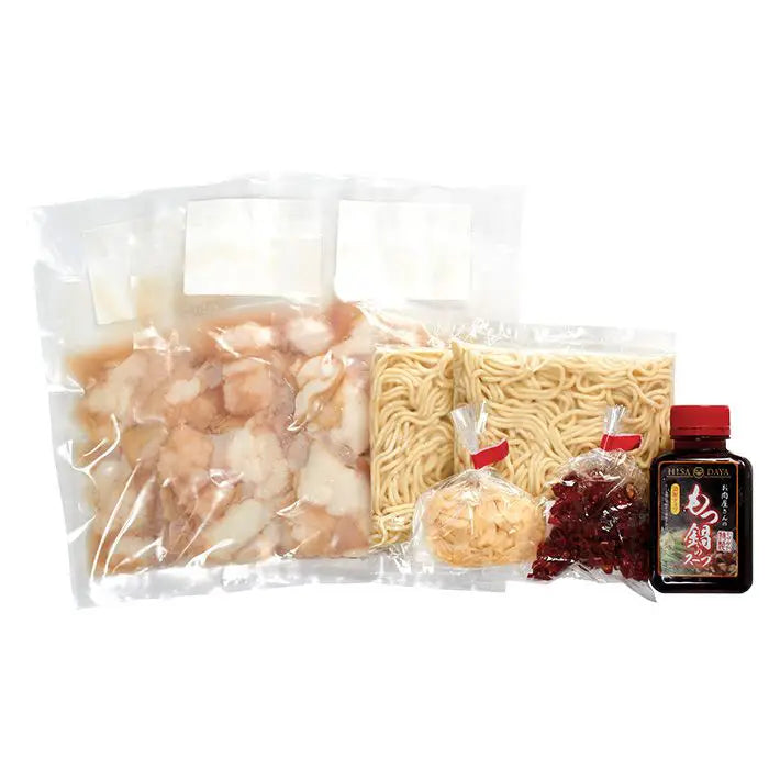 ● 内容量:国産牛小腸120g×3、自家製濃縮もつ鍋スープ180g×1、ちゃんぽん麺150g×2、乾燥にんにく10g×1、唐辛子5g×1