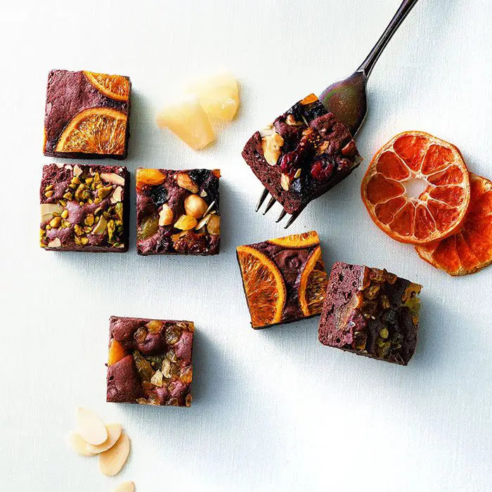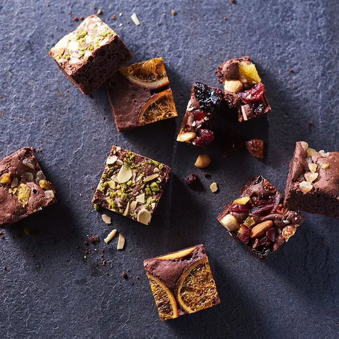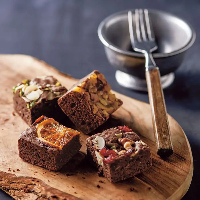 濃厚なチョコレートの生地に、香ばしいナッツや甘酸っぱいフルーツをトッピング。ピスタチオとアーモンド、ごろっとしたパイナップルやネーブル、たっぷりのドライフルーツとナッツ…。おいしさをぎゅっと詰め込んだキューブが、お口に小さなしあわせをお届けします。