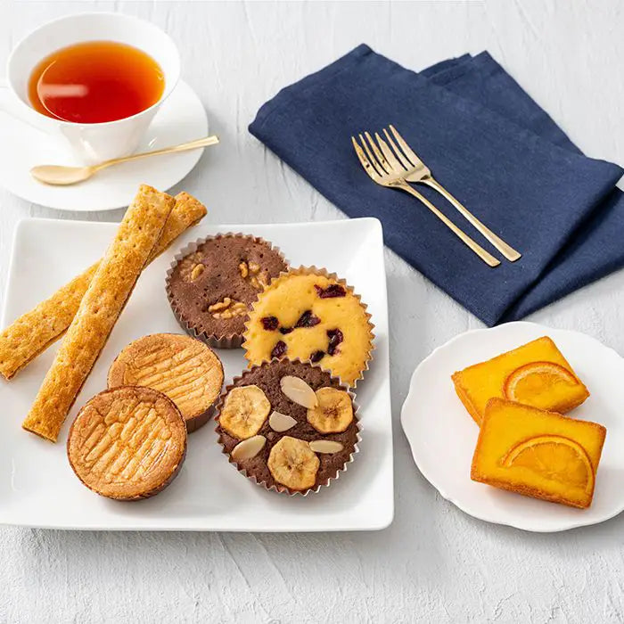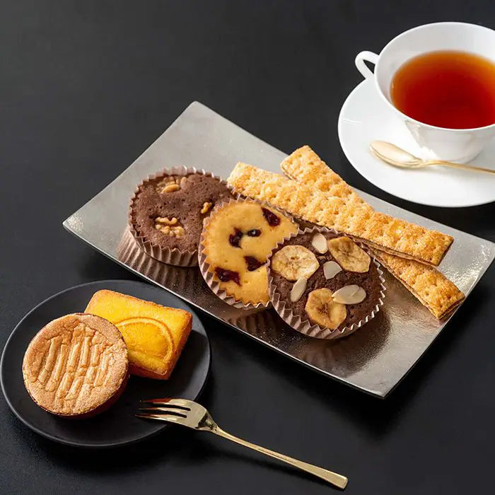 しっとり生地にフルーツやナッツを飾ったプチケーキやオレンジケーキ、さくっとした食感の中にキャラメルの風味が香る少し長いサイズのロングパイ、アーモンドが香ばしく香るフランス伝統の厚焼きクッキーと、ホテルの豊かなティータイムを演出するスイーツを詰め合わせました。