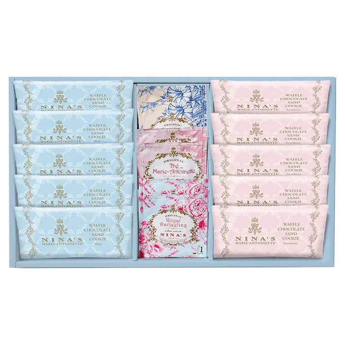 王妃マリー・アントワネットのラグジュアリー・ティーをイメージした、老舗フランス紅茶ブランド「ニナス」の紅茶と、チョコレートをサンドした香ばしいワッフルクッキーをセットでお届けします。