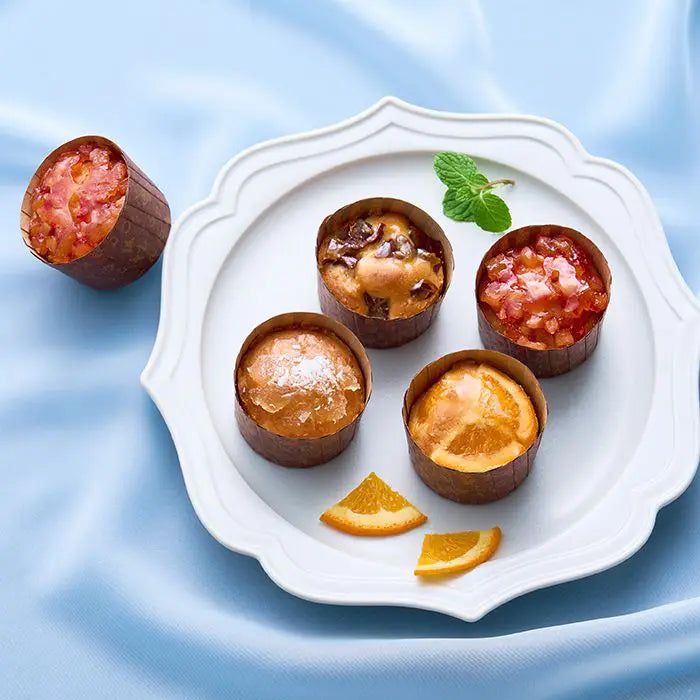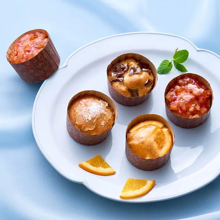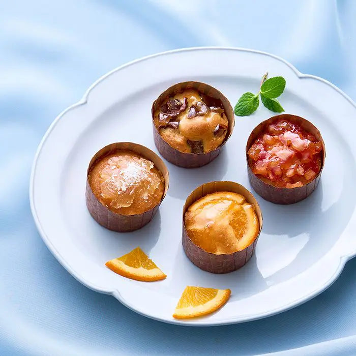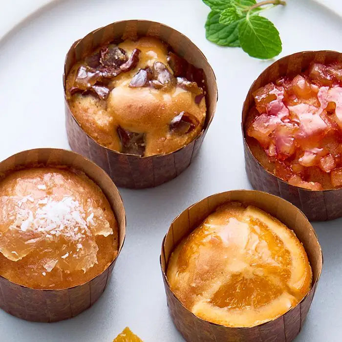 艶っと光るシロップ漬けの果実や、セミドライの果実がジュエリーのようなカップケーキです。空気をたっぷり含ませて焼きあげた、果実入りのなめらかな生地に煌めく果実たちをトッピングして、果実を味わうカップケーキに仕上げました。