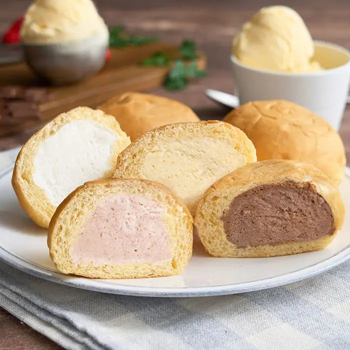 まるでアイスのような新感覚のくりーむパンは、特製のクリームで凍ったまますぐにお召し上がりいただけます。カスタード、チョコレート、あまおう苺、ミルクの4種類の味が楽しめます。