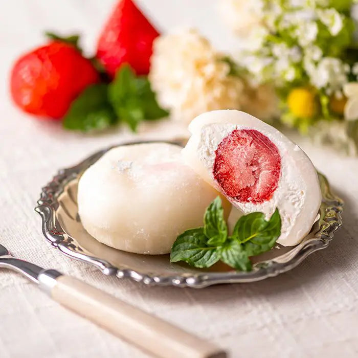 もち粉とうるち粉をブレンドしたやわらかく伸びのある大福で、ホイップクリームと福岡県産あまおうを1粒包み込みました。やわらかいお餅の食感といちごの酸味、やさしい甘さのクリームが1つになった味わいのバランスをお楽しみください。