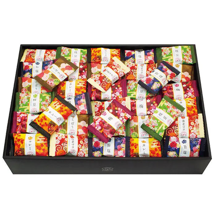 個性的な味と定番の味をベストバランスで詰合せました。缶ではなく箱にすることで廃棄の手間もなく置き場所もとりません。チャック付き袋でお手軽にいつでもおいしくいただけます。快適なライフスタイルにぴったりのおかきギフトです。