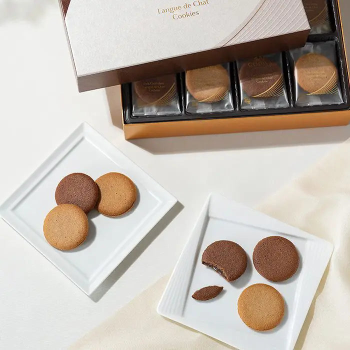 チョコレートを練りこんで軽やかに焼き上げたラングドシャでチョコレートをサンドしました。ミルクとダーク、2種類のチョコレートの味わいをお楽しみいただけます。