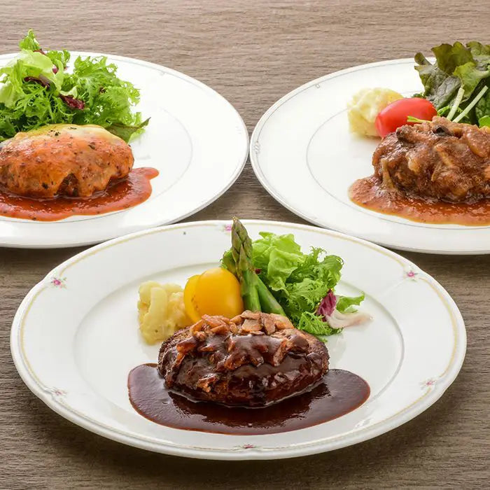 肉質にこだわり選び抜いた米沢牛と国産豚を使用した、お肉の旨みをお楽しみいただけるハンバーグです。黄木直営レストラン「金剛閣」のレシピで3種類のソースで仕上げました。湯煎して温めるだけでお召しあがりいただけます。
