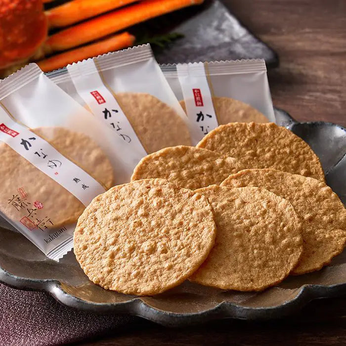 生地の半分以上にズワイガニの生身を練り込み、その後、10日間の熟成期間を経て仕上げに焼き上げます。かに本来の旨味をギュッと一枚の煎餅に詰め込んだ熟成かに煎餅です。