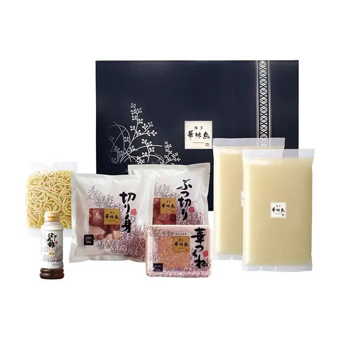 ● 内容量:水たき生スープ600g×2、華味鳥 切り身300g×1、華味鳥 ぶつ切り300g×1、華つくね200g×1、ちゃんぽん麺150g×1、博多ぽん酢220ml×1