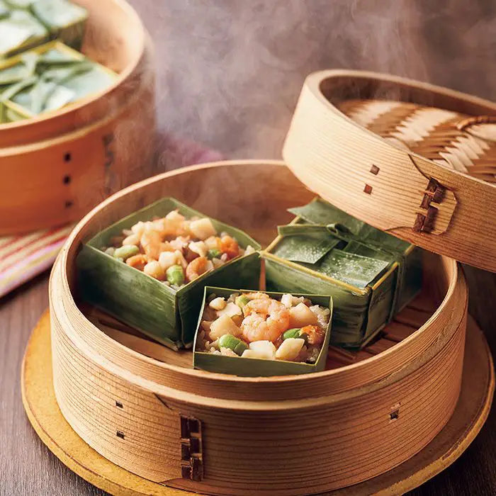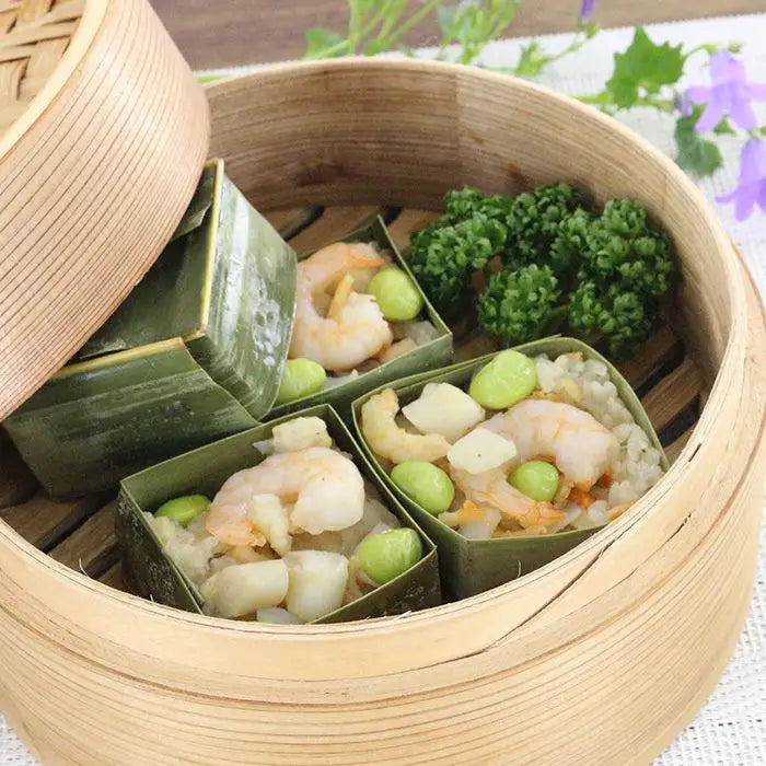 海老・いか・イタヤ貝などの海鮮素材がたっぷり入ったおこわのセットです。ココナッツの葉で作った篭に入っていて、目でも舌でも楽しめます。冷蔵庫解凍後に電子レンジで加熱するだけの簡単調理で召し上がれます。