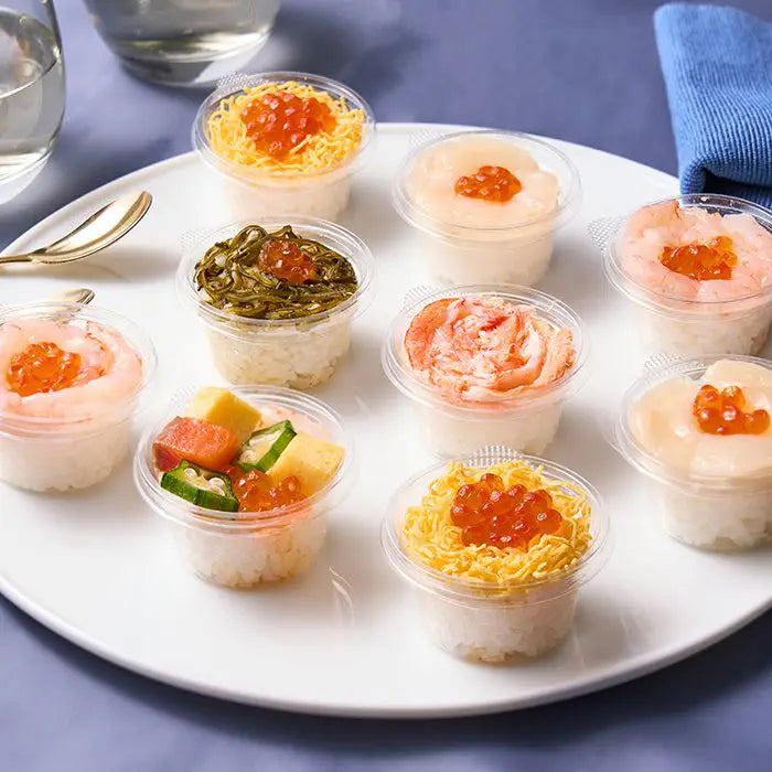 酢飯の上に、北海道産のほたて・いくら・紅ズワイガニをはじめ、甘えびやサーモン、めかぶと彩り豊かな素材を乗せ、直径5cmほどのカップ寿司に仕上げました。並べるだけで食卓が華やかになり、2~3口で食べられるプチサイズなので、オードブルや締めのひと品にピッタリ!クリスマスや年末年始などホームパーティーにどうぞ。