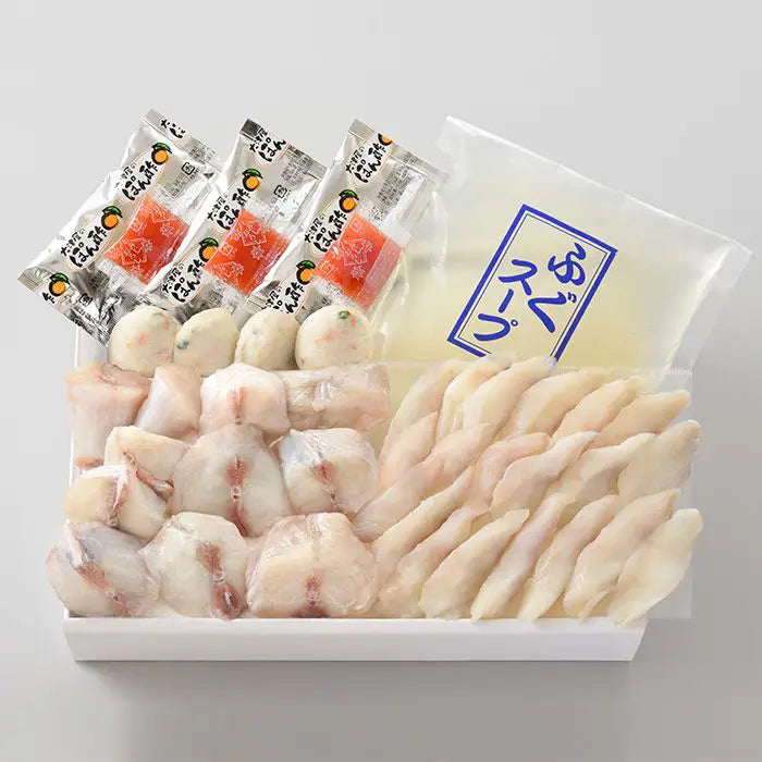 ● 内容量:真ふく切り身300g×1、真ふくスライス100g×1、ふく入りつみれ×4個、ふぐスープ500g×1、ぽん酢30ml×3、もみじおろし5g×3