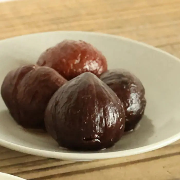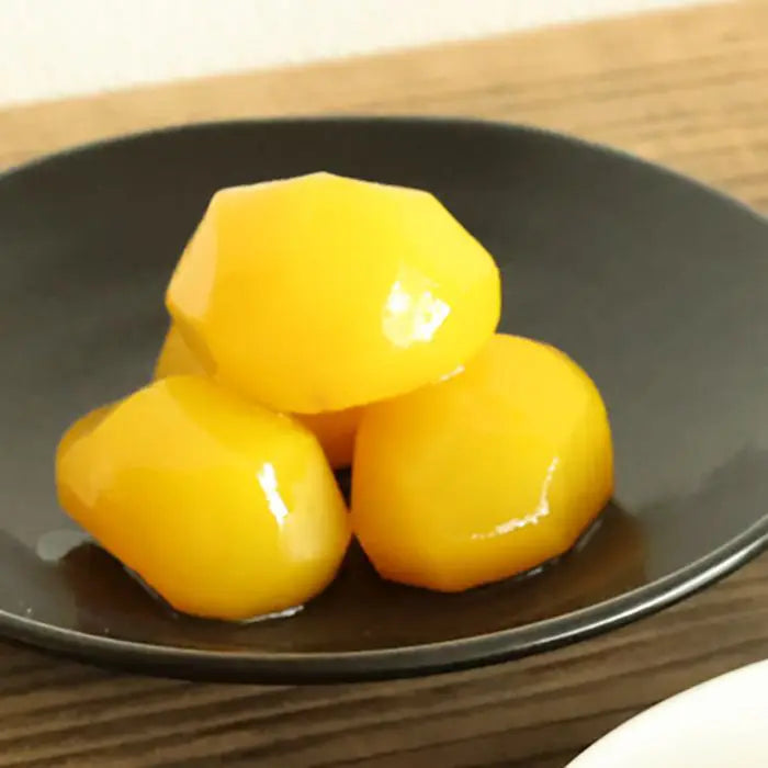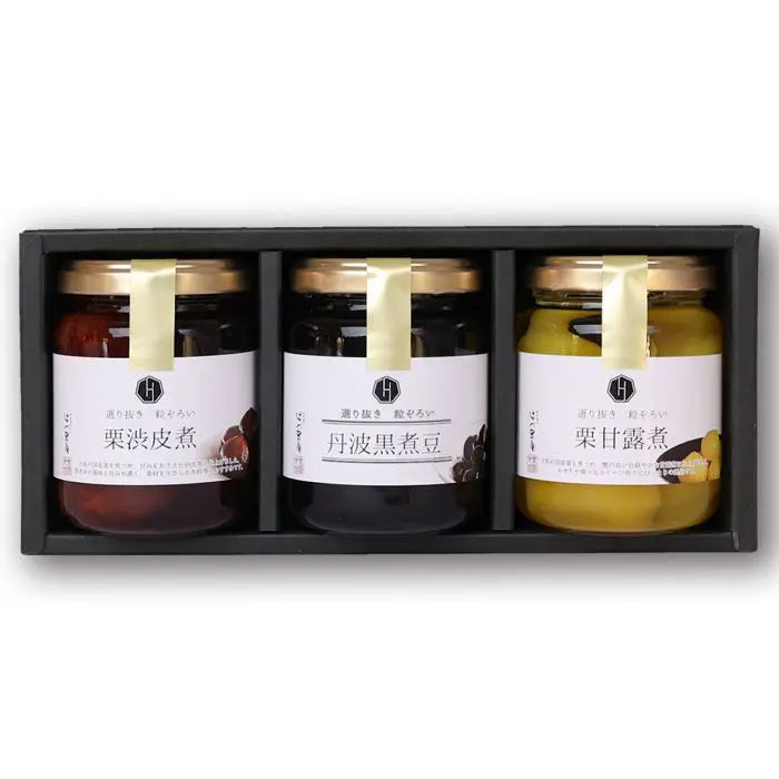 丹波黒大豆を漬け込み方式という独自の技法を用い、ふっくらとまろやかに煮上げた「丹波黒煮豆」、国産栗を丹念に渋皮付きのまま煮上げた「渋皮付き栗甘露煮」、色鮮やかに仕上げた「栗甘露煮」です。産地にこだわり、独自の技法で仕上げたお正月に重宝する商品です。